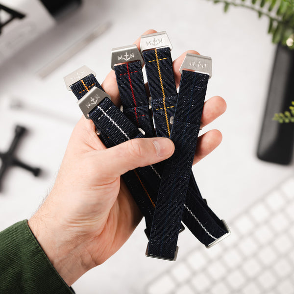 Crafted from material referenced after French Marine Nationale parachute braiding of the 1960s and 70s, Erika's Originals Watch Straps from the MN™ series of military-style watch straps are rich with style and history, featuring bold centerline stitching in coloured, as well as luminescent linen.