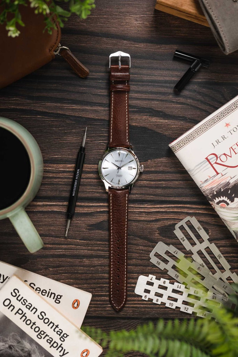 A pleasingly rustic watch strap with a natural and rugged appearance, the Boston strap from Hirsch bears the intricate texture of genuine buffalo calfskin and features substantial curved padding and a contrasting backstitched seam. Substantial, comfortable and exceptional value for money.