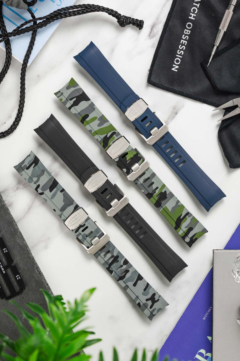 This new rendition of Crafter Blue's popular CB10 line of curved-end straps for Seiko SKX and 5 Sports watches features an upgraded base material; Fluorine Katschuk Material (FKM) is a fluoroelastomer rubber specially formulated for additional heat and chemical resistance, giving it a greater level of durability in adverse conditions than more conventional rubber straps.