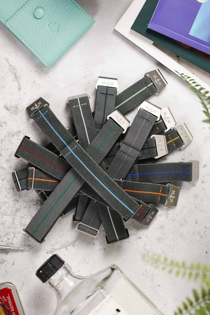 Styled after 1970s French Marine Nationale parachutes with a nylon and Spandex construction, the Mirage MN™ strap is a grey variety of the hugely popular adjustable one-piece strap created by Erika's Originals.