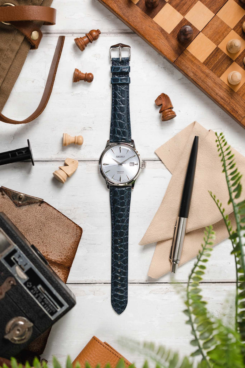 Genuine Louisiana alligator, barrel-dyed to the fibre and adorned with a diffuse, elegant two-tone finish. The strap is adorned with a hand-stitched, tone-on-tone edging for a look that's understated, yet deeply intricate.