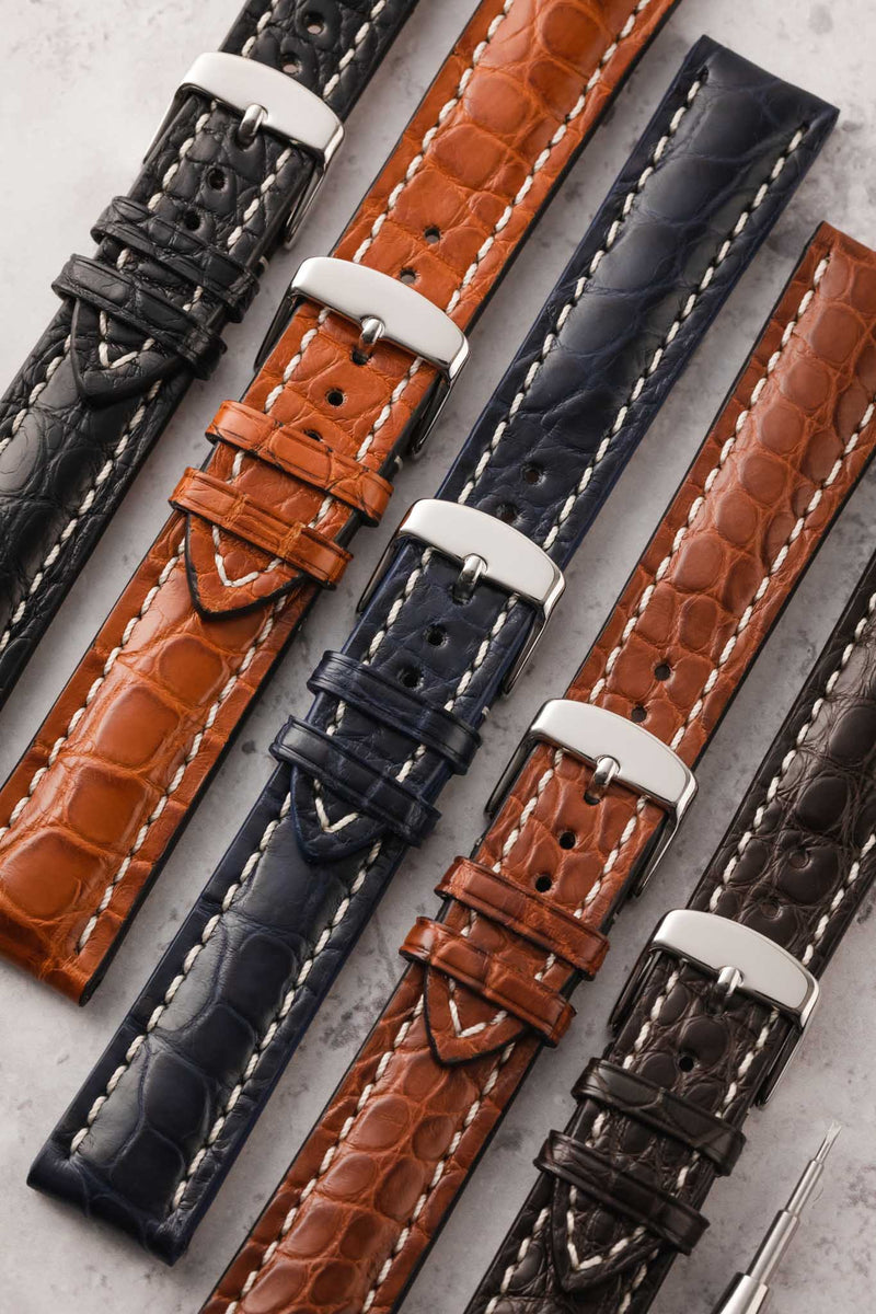 A thick and substantial watch strap wrought from genuine alligator hide, the Ambassador from Rios1931 carries a complex and richly detailed texture and has a natural, rugged and classically-styled allure that matches well to a wide variety of premium wristwatches.