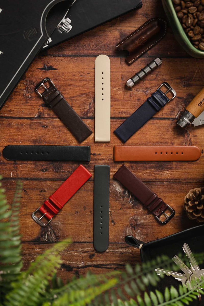 This minimalist and functional leather band is imbued with rich and vibrant colour in a matt finish; the wide selection of tones make it a great low-cost accompaniment to a wide variety of wristwatches.
