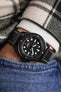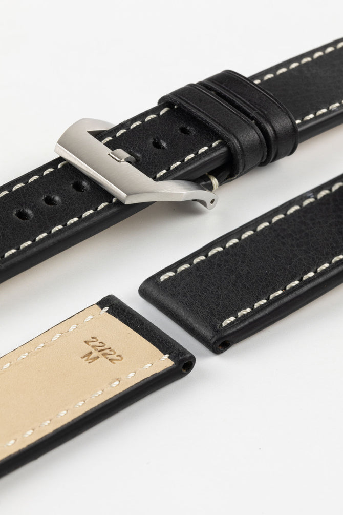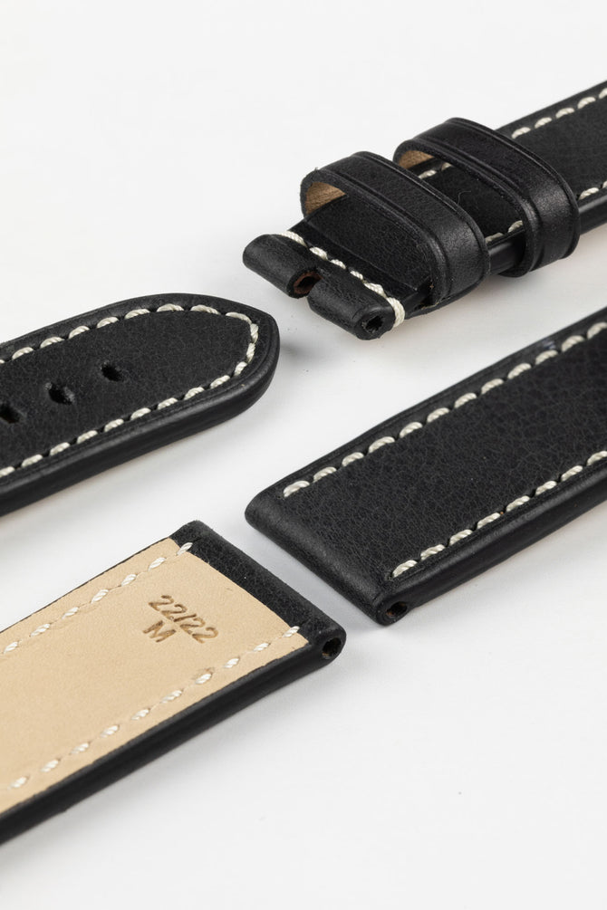 This beautifully minimalist watch strap lets the raw appeal of its natural leather construction stand front and centre, with only the framing of its cream stitchwork distracting from the richly detailed patina throughout.